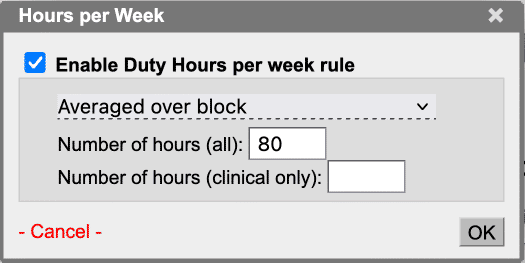 Sets the maximum number of Duty Hours per week. You can set one number for all hours and one for clinical hours. Leave either one empty if you do not need it.